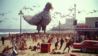 On the sun-drenched coast of Santa Monica, a day of oceanfront bliss turns into the scene of Pier Peril as a monstrous seagull, now known as Skyrend, stakes its claim on the iconic pier. The vast creature towers over the boardwalk, its shadow swallowing the joy of what was a bustling seaside retreat.