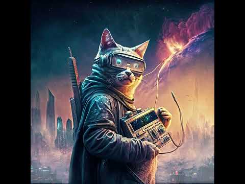 Zephyr, a Felinarian warrior, stands amidst the ruins of a futuristic city, his cat-like features exuding a sense of strength and agility. With a futuristic rifle secured on his back, he serves as a living communication device, a relic from the past in the form of a 1990s-inspired radio.