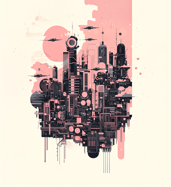 Under a cosmic peach-hued sky, this retro-futuristic city teems with soaring skyscrapers, zipping hovercrafts, and luminous pathways connecting the stars. A place where every glowing structure tells a tale of innovation, mystery, and boundless adventure.