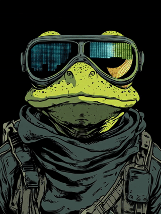 In the heart of the digital wetlands, where data streams flow like rivers and encrypted signals dance like fireflies, the Lily Pad Recon unit of the Amphibian Command: Frog Forces stands vigilant. This specialized operative, a frog with an unmatched ability to blend into any environment, is equipped with cutting-edge reconnaissance technology. His visor, a marvel of amphibian engineering, displays a cascade of real-time data, guiding him through the treacherous terrain of the cyber-swamp.