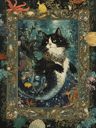 Make a statement in any room with Marina the Enchanted, a framed matte poster from the Paws of Legend collection. This captivating piece brings to life the allure of Marina, a mystical feline mermaid reigning over an enchanting underwater world. Framed with a refined matte black frame, Marina’s detailed form—adorned with oceanic treasures—floats gracefully amid vibrant corals and shimmering fish, creating an elegant ambiance for your wall.