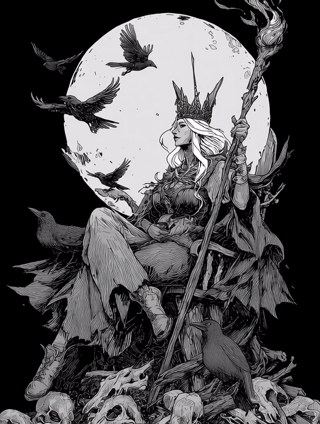 Now her throne drifts silently across the edge of worlds, accompanied by crows that speak only to the broken. Some say she watches the rift’s unraveling, waiting for the return of a soul long lost. Others say she will be the one to end it all—not with fire, but with silence.