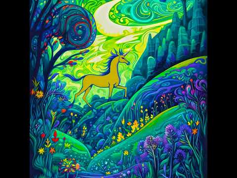 In a realm where colors merged in a symphony of vibrancy and shapes danced with surreal grace, there lived a golden horse known as the Wanderer. It roamed through hilly valleys, its radiant form standing out against the backdrop of vivid hues.