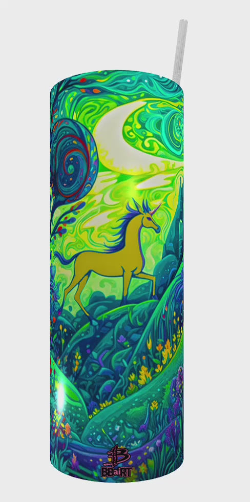 Venture into a realm where dreams flow in rivers of color and every breeze hums with magic. The Golden Wanderer, a radiant unicorn, strides boldly across vivid hills, leaving trails of golden brilliance in its wake. Driven by a quest for wonder and transformation, its journey paints the very world around it in hues of awe. Now, this timeless spirit can accompany you wherever you roam, captured beautifully on this durable tumbler.